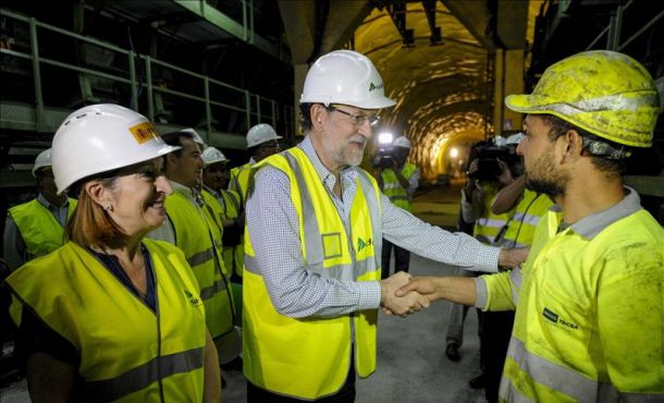 EFE – El presidente del Gobierno, Mariano Rajoy, no tiene «ni la más mínima duda» de que el PSOE y Podemos pactarán si logran mayoría suficiente en las próximas elecciones generales. En un encuentro con los medios de comunicación en la localidad gallega de Celanova,, tras visitar obras del AVE entre Madrid y Galicia, ha precisado que estos partidos, junto con otras formaciones, así lo han hecho tras las elecciones autonómicas y municipales, a pesar de que en la mayoría de los territorios la fuerza más votada ha sido el PP; este miércoles 19 de agosto 2015. <Fotografía:El presidente del Gobierno, Mariano Rajoy (c), que se encuentra de vacaciones en Galicia, junto a la ministra de Fomento, Ana Pastor, saluda a un trabajador durante la visita que ha realizado esta mañana a las obras de la Línea de Alta Velocidad (AVE) en el túnel de Prado (Vilar de Barrio). EFE>.