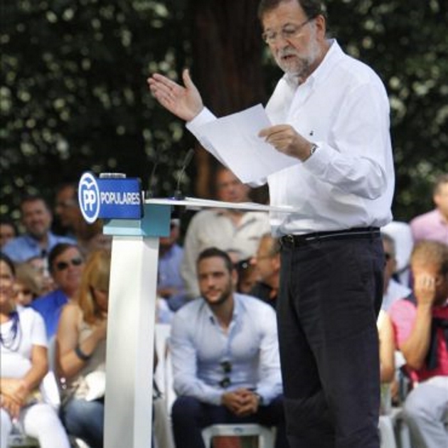 EFE – El presidente del Gobierno, Mariano Rajoy, ha vuelto a subrayar hoy, 30 de agosto 2015, ante las elecciones catalanas del 27S, que seguirá defendiendo la unidad de España y la soberanía nacional, y ha hecho una advertencia: «No vamos a dejar que nadie convierta a españoles en extranjeros». <Fotografía: El presidente del Gobierno y del Partido Popular, Mariano Rajoy, durante su intervención en el acto del partido celebrado hoy en esta localidad donde ha avisado de que «lo peor» que le puede ocurrir a España en las elecciones generales de final de año «es esa coalición que algunos ya están preparando contra quien va a ganar las elecciones», en alusión a su partido, el PP.Rajoy ha aludido con este mensaje a la eventual coalición entre Podemos y el PSOE, partido contra el que ha sido muy crítico. Foto/Efe>.