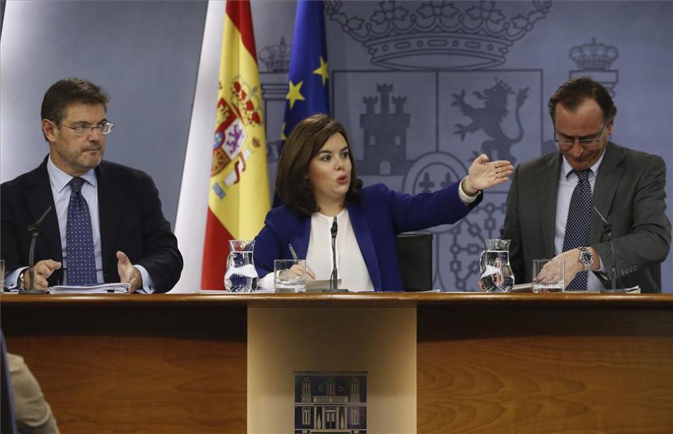 Agencias – La vicepresidenta del Gobierno, Soraya Sáenz de Santamaría Antón, ha dicho hoy que el Ejecutivo recurrirá al Tribunal Constitucional (TC) la moción golpista de las candidaturas separatistas excluyentes en el Parlamento autonómico de Cataluña: Juntos Por El Sí (JxSí) y Candidatura de Unidad Popular (CUP) si el lunes 9 de noviembre 2015 se aprueba en el Parlamento catalán y «en ese mismo minuto» pedirá su suspensión, de manera que nadie podrá ejecutar ninguna actuación en cumplimiento de esa iniciativa. Madrid, 6 noviembre 2015. <Fotografía: La vicepresidenta del Gobierno, Soraya Sáenz de Santamaría, y los ministros de Sanidad, Alfonso Alonso (d), y Justicia, Rafael Catalá (i), durante la rueda de prensa posterior a la reunión del Consejo de Ministros. Foto/efe>.