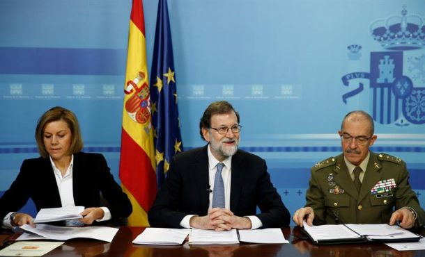 Efe – Lo que el Ejecutivo recalca es que tanto Junts per Catalunya como ERC sabían a la hora de hacer sus listas electorales la situación procesal en que se encontraban Puigdemont, Oriol Junqueras y otros exconsejeros catalanes que permanecen en prisión o fuera de España. Fuentes del Gobierno de Mariano Rajoy aseguran a Efe que, permaneciendo en Bruselas, Puigdemont nunca podrá ser investido y se limitan a remitir a la decisión judicial que se adoptará en su caso si el expresident decide regresar a España, es detenido y depende de un juez que pueda acudir o no a una sesión de investidura. Madrid (España), domingo 24 de diciembre de 2017. Fotografía: MADRID (ESPAÑA), PRESIDENCIA DE GOBIERNO DEL REINO DE ESPAÑA. 24.12.2017.- El presidente del Gobierno, Mariano Rajoy (c), acompañado por la ministra de Defensa, María Dolores de Cospedal (i), y el jefe del Estado Mayor de la Defensa (jemad), el general Fernando Alejandre (d), mantiene una videoconferencia con las unidades españolas en misiones humanitarias y de paz en el extranjero desde el Palacio de la Moncloa, para agrader a los militares españoles en el exterior su trabajo en estas fechas navideñas cumpliendo con su deber de proteger a los ciudadanos dentro y fuera de nuestras fronteras. Efe.