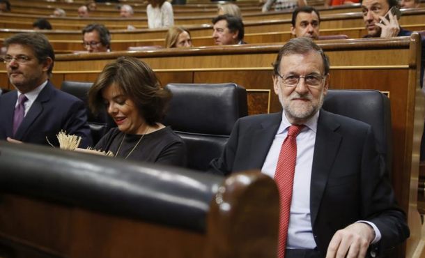 Lasvocesdelpueblo y Agencias – «Digo a todos: estén tranquilos, el Gobierno sabe perfectamente lo que tiene que hacer y, desde luego, no va contribuir a esa subidas de tono de las declaraciones que están haciendo algunos», ha afirmado Rajoy en los pasillos del Congreso. Madrid (España), miércoles 12 de julio de 2017. Fotografía: El presidente del Ejecutivo, Mariano Rajoy (d), y la vicepresidenta, Soraya Sáenz de Santamaría (i), al inicio de la sesión de control al Gobierno celebrada hoy en el Congreso. Efe.