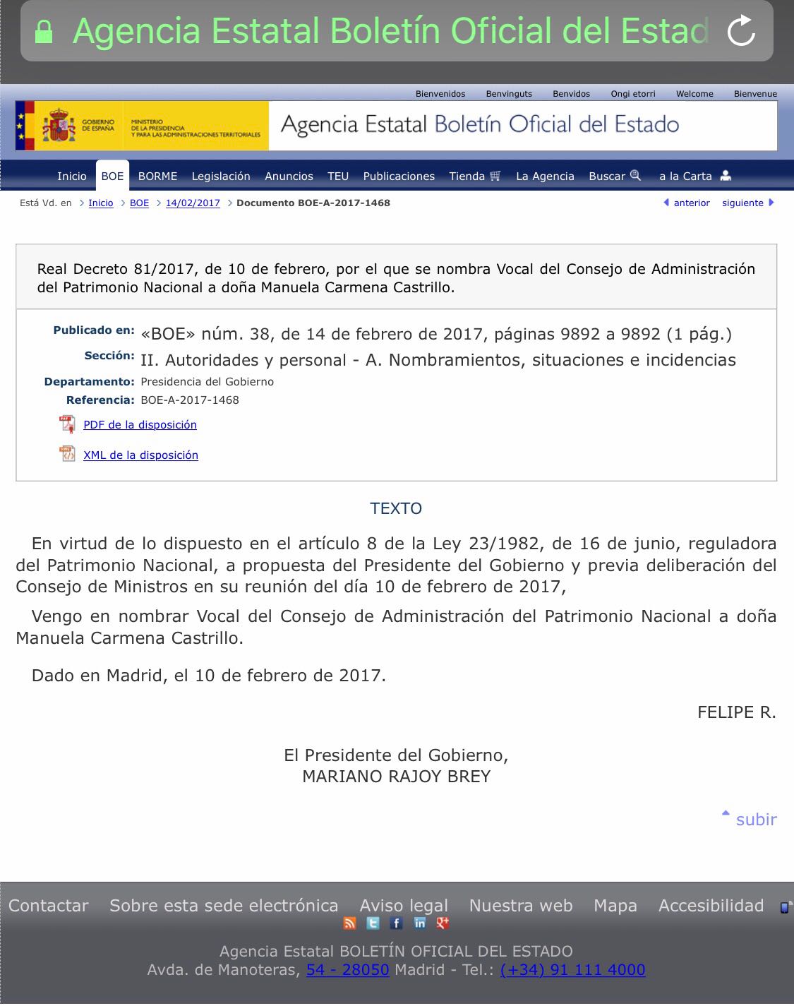 1468. Real Decreto 81/2017, de 10 de febrero, por el que se nombra Vocal del Consejo de Administración del Patrimonio Nacional a doña Manuela Carmena Castrillo.