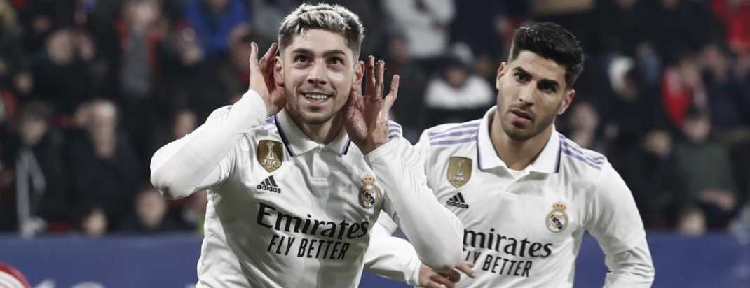 Pamplona (España), sábado 18 de febrero de 2023. El Real Madrid se llevó tres complicados puntos en El Sadar frente a Osasuna (0-2) gracias a los goles de Valverde y Asensio en los minutos finales que desatascaron un choque muy disputado que carga a los blancos de moral.