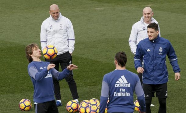 Efe – El Real Madrid viaja a Nápoles para disputar el partido de vuelta de los octavos de final de la Liga de Campeones. La lista de convocados la integran: Keylor Navas, Kiko Casilla, Rubén Yáñez, Dani Carvajal, Danilo, Pepe, Sergio Ramos, Nacho Fernández, Marcelo, Casemiro, Kroos, Kovacic, Modric, Isco, Marco Asensio, James, Lucas Vázquez, Bale, Cristiano Ronaldo, Benzema, Álvaro Morata y Mariano. Madrid (España), lunes 6 de marzo de 2017. Fotografía: El entrenador del Real Madrid, Zinedine Zidane (2i), y su ayudante David Bettoni (2d) observan a los jugadores Luka Modric (i), Gareth Bale (c) y Mateo Kovacic (d), durante un entrenamiento la semana pasada. Efe.