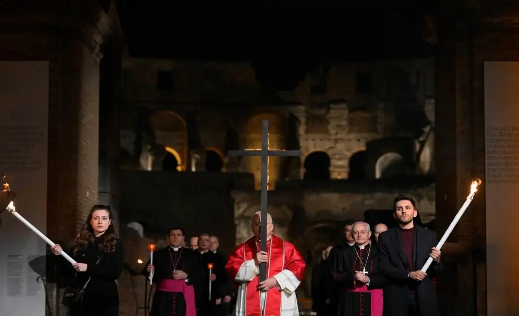 En su primer Viernes Santo como Pontífice, Prevost recorre las catorce estaciones del Vía Crucis en el Coliseo llevando personalmente la Cruz, en un gesto de profunda fuerza espiritual que evoca el sufrimiento del mundo contemporáneo y la esperanza cristiana.