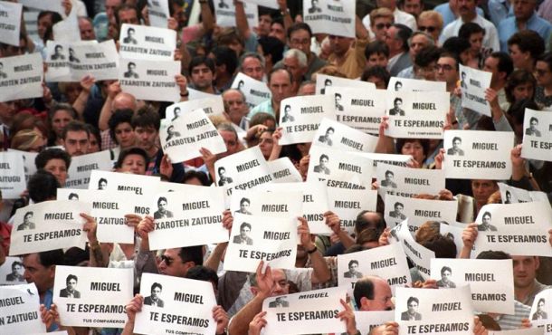 Efe – «Nos dijeron que fuéramos por carreteras secundarias, comarcales, sendas, que miráramos cualquier lugar donde pudiera estar retenido Miguel Ángel Blanco, pero sobre todo en casas y naves abandonadas o en vehículos grandes». Madrid (España), lunes 10 de julio de 2017. Fotografía: En la imagen, fotografía de archivo del 11-7-1997 de la manifestación que miles de personas llevaron a cabo en Ermua (Vizcaya) para pedir la libertad de Miguel Angel Blanco secuestrado por ETA. Archivo Efe.