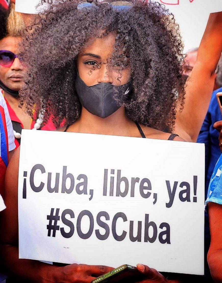 Cubanos, residentes en Madrid (España), protestan frente la embajada de su país en la capital del Reino de España, ante las detenciones arbitrarias de los manifestantes por parte del régimen castrista, después de las espontaneas marchas ciudadanas contra el régimen comunista de Cuba del pasado domingo, 11 de julio de 2021, por las calles de Cuba, sin miedo al régimen de los Castro y al Partido Comunista de Cuba.