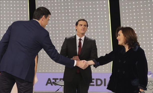 Efe – La vicepresidenta del Gobierno, Soraya Sáenz de Santamaría, ha defendido hoy que tras las elecciones generales del 20 de diciembre, gobierne la lista más votada ante la posibilidad de que PSOE, Ciudadanos y Podemos acuerden «un tripartito de perdedores» para desbancar al PP. Madrid, 7 diciembre 2015. Fotografía: El secretario general del PSOE, Pedro Sánchez (izq.) saluda a la vicepresidenta del Gobierno y candidata por Madrid al Congreso, Soraya Sáenz de Santamaría, en presencia del presidente de Ciudadanos, Albert Rivera (c) antes del debate. EFE