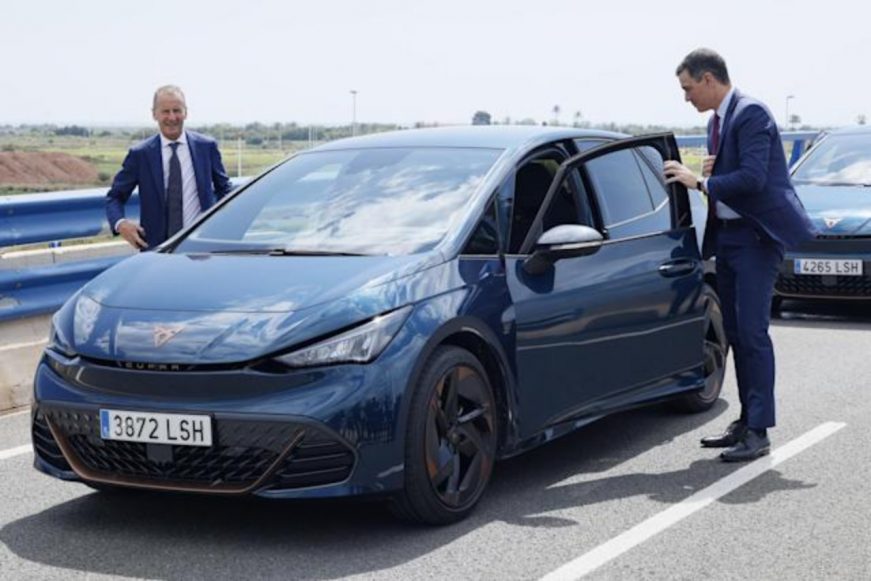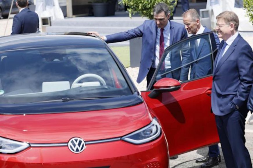 FOTOGRAFÍA. SAGUNTO (VALENCIA), 05.05.2022. El presidente del Gobierno, Pedro Sánchez, (d) y el presidente del Grupo Volkswagen, Herbert Diess, (i) a su llegada a acto de presentación de la nueva gigafactoría de baterías para coches eléctricos que la firma alemana construirá en Sagunto (Valencia), que generará más de 3.000 empleos directos, un día después de que el Grupo Volkswagen y Seat, en alianza con 62 empresas, registraran el proyecto «Future: Fast Forward» para convertir a España en centro de distribución del coche eléctrico en Europa. EfeFOTOGRAFÍA. SAGUNTO (VALENCIA), 05.05.2022. El presidente del Gobierno, Pedro Sánchez, interviene en el acto de presentación de la nueva gigafactoría de baterías para coches eléctricos que la firma alemana construirá en Sagunto (Valencia), que generará más de 3.000 empleos directos, un día después de que el Grupo Volkswagen y Seat, en alianza con 62 empresas, registraran el proyecto «Future: Fast Forward» para convertir a España en centro de distribución del coche eléctrico en Europa. Efe