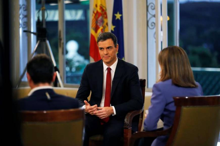 Lasvocesdelpueblo y Agencias: También ha garantizado que va a exhumar a los restos del caudillo español, Francisco Franco, del Valle de los Caídos. Por otra parte, curiosamente, el PSOE no piensa derogar la Reforma laboral del PP. Presidente de Gobierno de España, Pedro Sánchez (PSOE): Intentará «agotar la legislatura» y no convocar elecciones generales hasta el año 2020. «Aspiro a convocar elecciones en el año 2020, a agotar la legislatura». El presidente socialista ve «razonable» acercar a los presos racistas golpistas independentistas en prisión preventiva a cárceles más próximas a sus lugares de origen una vez termine la fase de instrucción de la causa del proceso independentista, que se lleva a cabo en el Tribunal Supremo, ha dicho durante su primera entrevista. Madrid (España), martes 19 de junio de 2018. Fotografía: MADRID (ESPAÑA), 18.06.2018. El presidente del Gobierno, Pedro Sánchez (c), acompañado por los presentadores Ana Blanco (d) y Sergio Martín, al comienzo de la entrevista que concede a TVE, la primera que ofrece desde que accedió al cargo, hoy en el Palacio de La Moncloa. Efe