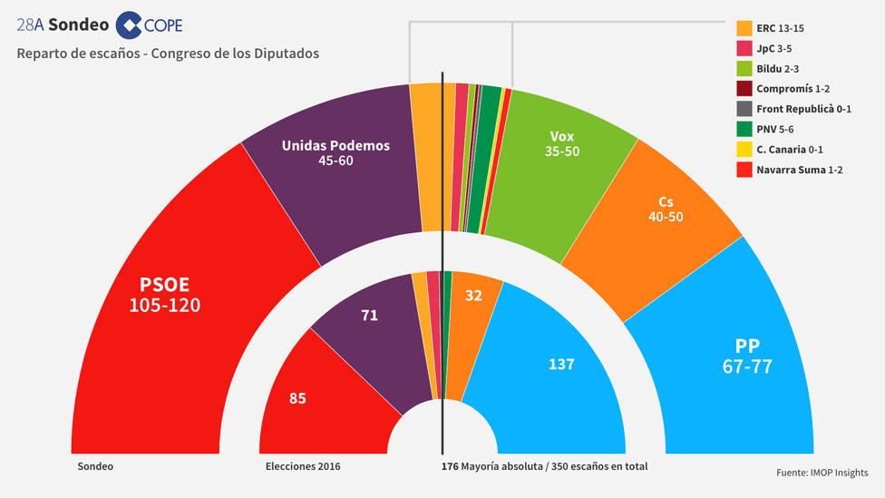 Sin embargo, Sánchez necesitará de nuevo del apoyo de Podemos y los independentistas para mantenerse en el Gobierno. Los de Pablo Iglesias pierden presencia en el Congreso con respecto a 2016 pero logran disipar el fantasma del descalabro. Según el sondeo de COPE, Iglesias obtendrá el 16,8% de los votos y entre 45 y 60 escaños.
