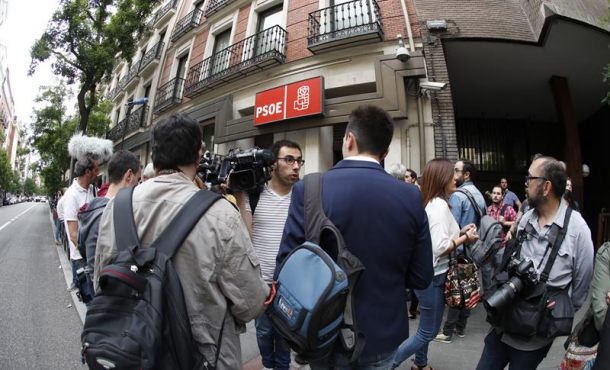 Agencias – A diferencia de Sánchez, Susana Díaz y López han llegado a pie a la sede socialista, donde han pronunciado unas palabras de agradecimiento y apelando a la unidad. Madrid España), domingo 21 de mayo de 2017. Fotografía: Periodistas congregados esta tarde ante la sede del PSOE en la madrileña calle Ferraz, durante el seguimiento de la jornada de elecciones primarias para la Secretaría General en el partido. Efe.