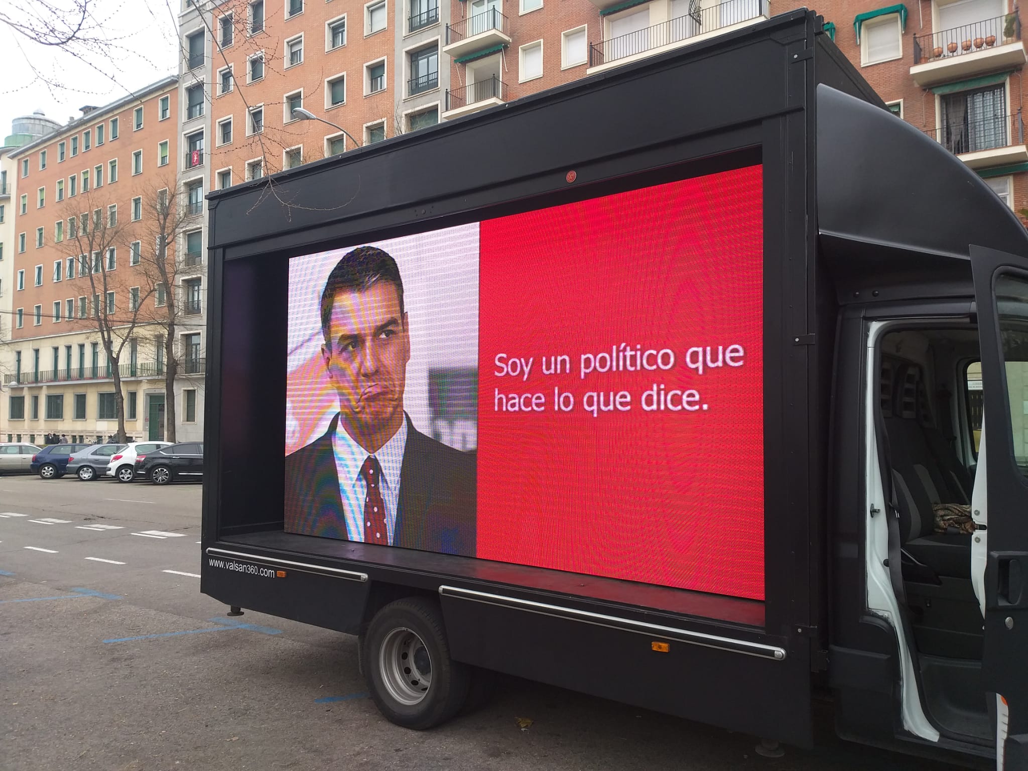 VÍDEO. Barcelona, 2.01.2020. «Sánchez, mentiras y cintas de vídeo: las falsas afirmaciones de Pedro Sánchez sobre sus alianzas». El 3 de enero de 2020, un camión publicitario dotado de una pantalla gigante circula por Madrid emitiendo imágenes y textos de diversas declaraciones de Pedro Sánchez.