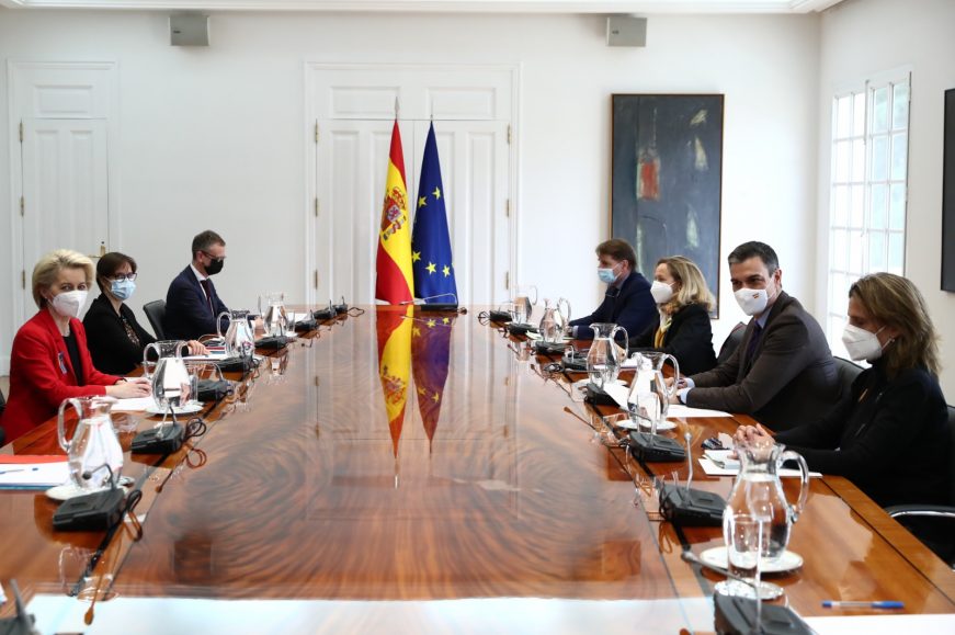 En la reunión, Sánchez y Von der Leyen han estado acompañados por la vicepresidente primera del Gobierno y ministra de Asuntos Económicos y Transformación Digital, Nadia Calviño, y la vicepresidente tercera del Gobierno y ministra para la Transición Ecológica y el Reto Demográfico, Teresa Ribera.