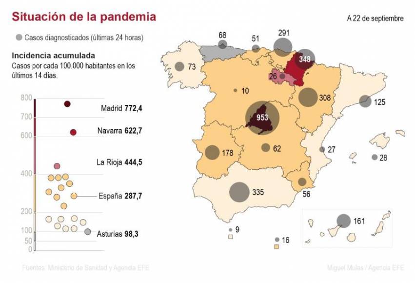 Ese dato también varía significativamente en los distintos territorios: Madrid, a la cabeza, tiene una incidencia acumulada de 772; Navarra, 622; La Rioja, 444; Aragón, 388; Castilla-La Mancha, 383; Murcia, 382; y Castilla y León, 351.