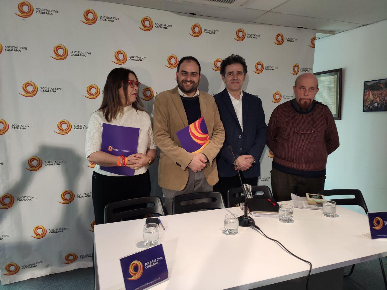 El presidente de Societat Civil Catalana, Fernando Sánchez Costa; el vicepresidente, Álex Ramos; la vocal de la junta directiva, Sonia Reina; y el responsable de la agrupación territorial de la entidad en Barcelona, Miguel Candel; han presentado este viernes los proyectos de la asociación para los próximos meses.