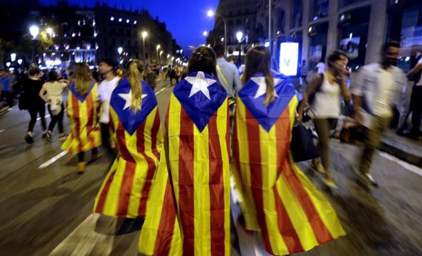 Lasvocesdelpueblo y Agencias – La preocupación de los ciudadanos por la independencia de Cataluña se ha triplicado en los últimos dos meses, según el barómetro del Centro de Investigaciones Sociológicas (CIS) de septiembre, en el que el 7,8 por ciento de los encuestados lo señala como uno de los tres principales problemas del país. Barcelona (España), jueves 5 de octubre de 2017. Fotografía: Varias jóvenes, adoctrinados en Cataluña contra España, con banderas esteladas caminan por plaza de Catalunya tras una manifestación separatista. Efe.