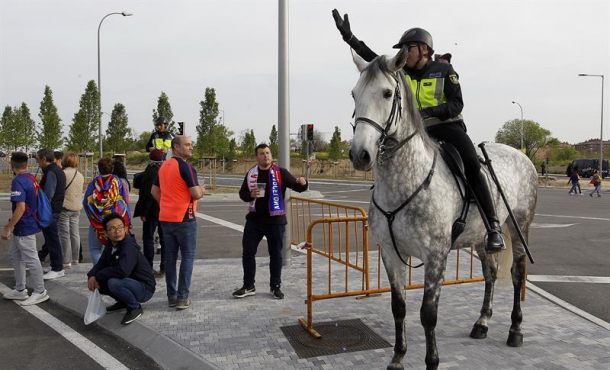 Efe – El autobús, según informó uno de sus ocupantes, tomó una ruta que pasaba próxima a la zona de los seguidores del Barcelona y, en una parada, algunos radicales lanzaron distintos objetos contundentes que rompieron una luna del vehículo. Madrid (España), sábado 21 de abril de 2018. fotografía: MADRID (ESPAÑA), 21.04.2018. Los aficionados fueron abordados por las medidas de seguridad en las afueras del estadio Wanda Metropolitano, en Madrid, antes de comenzar la final de la Copa del Rey que juegan el Sevilla FC y el FC Barcelona. Efe