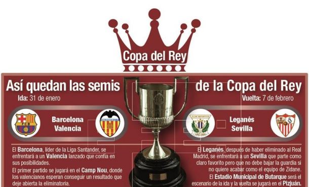 Leganés-Sevilla y Barcelona-Valencia son los emparejamientos de semifinales de la Copa del Rey, según deparó el sorteo celebrado este viernes en la sede de la Real Federación Española de Fútbol en Las Rozas (Madrid).