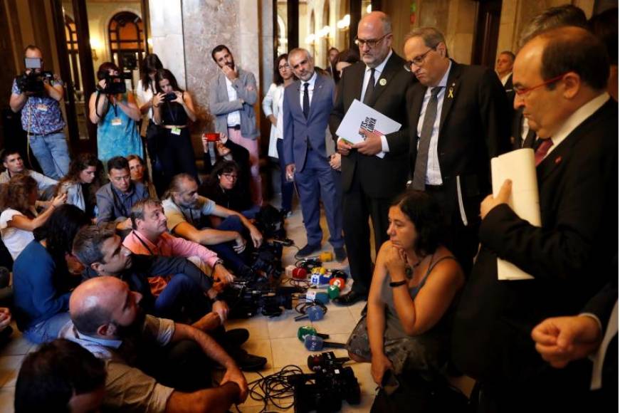 Efe – Más de una treintena de periodistas parlamentarios han protagonizado una sentada en los pasillos del Parlament antes de que empezara el pleno de este miércoles, en protesta por las agresiones que sufren algunos profesionales de la información cuando cubren manifestaciones en Cataluña. Barcelona (España), miércoles 9 de octubre de 2019.