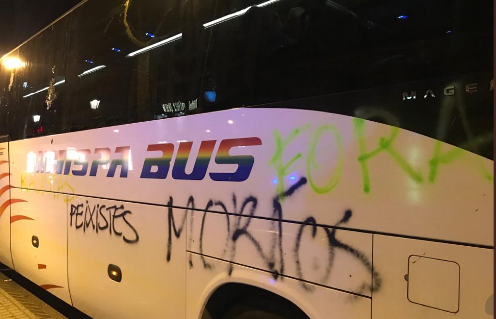 Redacción.- Autocar Barcelona-Madrid (España), 08 de marzo de 2020. Un grupo de más de medio centenar de jóvenes separatistas y feministas encapuchados han atacado la medianoche del sábado 7 de marzo a domingo 8 de marzo al autocar de los catalanes, afiliados y militantes del partido político Vox en Plaza de Cataluña de Barcelona con excrementos, según algunos de los pasajeros, «caca de vaca», pintura y letreros como «muerte fascistas».