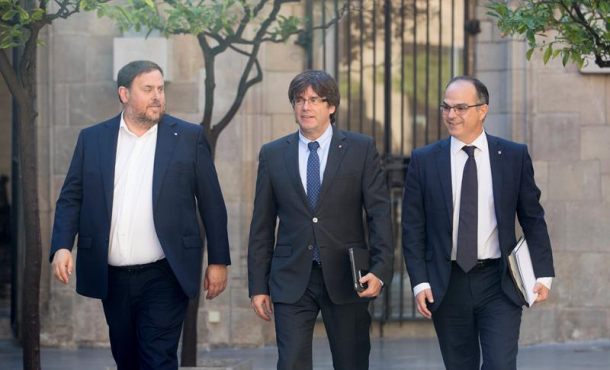 Lasvocesdelpueblo y Agencias – Gobierno de la Generalidad de Cataluña: «Si al final se proclama un Estado (catalán), lo que diga» el ministro de Hacienda del Gobierno de España, Cristóbal Montoro, «tendrá la misma incidencia que cualquier ministro de cualquier país tercero. Muy amigo, muy querido, pero habrá la normativa catalana», ha dicho hoy, martes 5 de septiembre de 2017, el portavoz del Gobierno de Cataluña, Jordi Turull. Barcelona (España), mates 5 de septiembre de 2017. Fotografía: El presidente de la Generalidad de Cataluña, Carles Puigdemont (c), junto al vicepresidente y consejero de Economía, Oriol Junqueras (i), y el consejero de la Presidencia, Jordi Turull (d), se dirigen hoy a la reunión semanal del Govern en la víspera del pleno del Parlamento de Cataluña en el que las fuerzas separatista prevén aprobar la ley para hacer posible el referéndum del 1 de octubre. Efe.