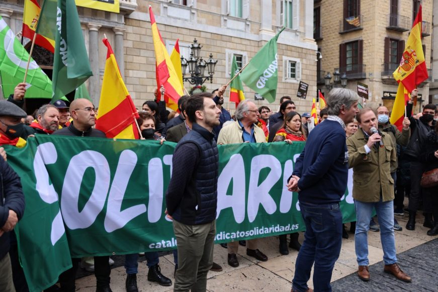 Redacción.- Plaza San Jaime (Barcelona) España, sábado 19 de marzo de 2022. Los catalanes, movilizados por VOX partido obrero y español, que preside Santiago Abascal Conde, y el sindicato de los Trabajadores Españoles Solidaridad, que lidera Rodrigo Alonso Fernández, han clamado este mediodía en Plaza San Jaime (Ayuntamiento de Barcelona), Plaza de la Fuente (Ayuntamiento de Tarragona), Plaza del Vino (Ayuntamiento de Gerona), Plaza de la Paeria (Ayuntamiento de Lérida) y resto de España como en Plaza Cibeles (Madrid), Plaza del Ayuntamiento (Alicante), etc. por las subidas históricas de los combustibles, de la luz, gas y Butano, bajo lema «El Gobierno te está saqueando. ¡Sa a defenderte!». Las protestas de VOX y Solidaridad coinciden con la huelga indefinida en el sector del transporte de mercancías por carretera por la subida de los combustibles —convocada el pasado lunes, 14 de marzo de 2022, por la minoritaria Plataforma en Defensa del Sector del Transporte de Mercancías por Carretera Nacional e Internacional ante el silencio de los principales sindicatos del sector—, que cumple este sábado su sexto día consecutivo, y ya ha comenzado a provocar problemas de desabastecimiento en el sector ganadero, y grandes superficies dado que no se está permitiendo la llegada de camiones con las materias primas básicas a las fábricas de piensos, etc..