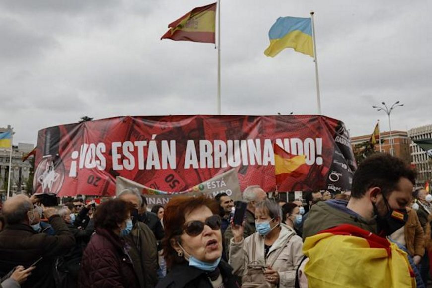 Lasvocesdelpueblo y Agencias.- Madrid (España), sábado 19 de marzo de 2022. Seguidores del sindicato de los Trabajadores Españoles Solidaridad y Vox partido Obrero y Español se han concentrado este sábado frente a los ayuntamientos de distintas ciudades de España para exigir la «dimisión» del Gobierno de coalición socialcomunista de España del presidente Pedro Sánchez Pérez Castejón, la convocatoria de elecciones y el abaratamiento del coste de la energía y el combustible, en una movilización nacional convocada por el sindicato Solidaridad que lidera Rodrigo Alonso Fernández y la formación verde española que lidera Santiago Abascal Conde.