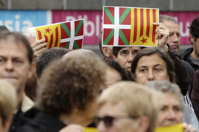 Efe – Con una subida semestral de 7 puntos, una mayoría del 65 % mantiene la compatibilidad de identidades vasca y española. Los deseos de independencia siguen siendo minoritarios en la sociedad vasca (28 %). De celebrarse un referéndum, el «no» a la independencia (37 %) volvería a ganar al «sí» (32 %), aunque este rechazo retrocede 10 puntos en el último semestre (hacia la abstención) y el «sí» avanza ligeramente (2 puntos). El rechazo a la independencia se reforzaría si ésta supusiese una salida de la UE (en este caso el «sí» se reduciría al 28 %). Vitoria (España), viernes 13 de julio de 2018. Fotografía: BILBAO (ESPAÑA), 03.12.2017. Convocan las entidades proetarras. Han pasado dos días después del golpe de estado racista en Cataluña, el 1-O de 2017. El fascismo intenta para a Cataluña con una huelga salvaje ante la brutal cortando vías ferroviarias, puertos, calles, etc. ante resistencia de la Cataluña pacífica. Lejos de allí, el fascismo se moviliza en las Vascongadas para mostrar su apoyo a los golpistas porque la derrota del racismo en Cataluña tendría consecuencia en el racismo vasco. Según Efe, «Cientos de personas se han movilizado hoy en el País Vasco, llamados por los sindicatos nacionalistas ELA y LAB, entre otros, en solidaridad con las organizaciones catalanas que han convocado una huelga general en protesta por la actuación policial del domingo en Cataluña. En San Sebastián, medio millar de manifestantes se han concentrado ante el Ayuntamiento, en los jardines de Alderdi Eder, con ikurriñas, Esteladas independentistas y enseñas de los diferentes sindicatos convocantes. Sostenían la pancarta, en la que se podía leer en euskera «Tanto en Cataluña como en Euskal Herria, que el pueblo decida. Votar para decidir», los secretarios generales de ELA y de LAB, Adolfo «Txiki» Muñoz y Garbiñe Aranburu, respectivamente. Los manifestantes, convocados por estos dos sindicatos y por ESK, Hiru, Steilas y la plataforma Etxalde, han coreado consignas en las que han tachado de «neofranquista» al PP y han exigido el «fin de la represión» y la aplicación del derecho a decidir tanto en Cataluña como en el País Vasco». Efe