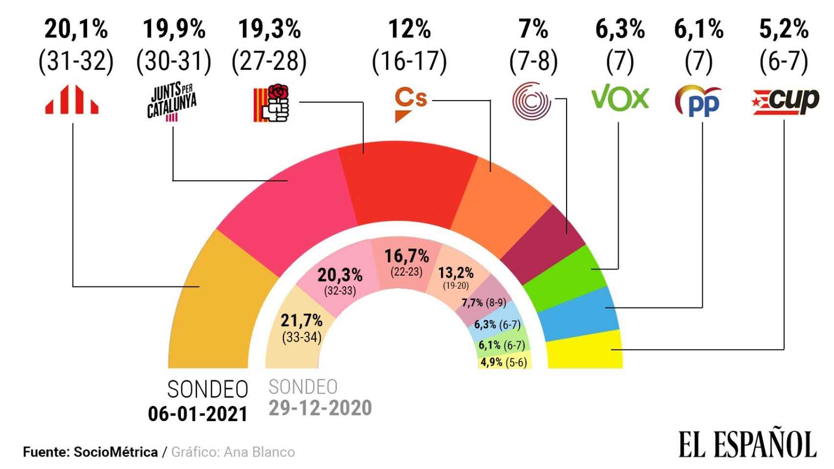 El segundo partido más votado seguiría siendo JxCat, que perdería cuatro décimas en siete días pero mantendría el 19,9% de los sufragios.