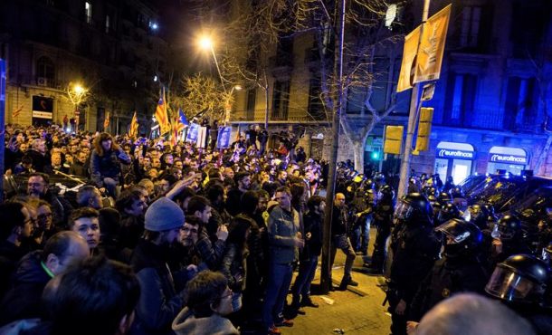 Efe – En medio de escenas de tensión, los concentrados, algunos de los cuales han quemado fotografías del Rey, están coreando consignas como «libertad presos políticos» y «fuera las fuerzas de ocupación». En un mensaje en las redes sociales, los Mossos d’Esquadra han pedido a los participantes en la protesta que sigan las instrucciones policiales y no intenten traspasar las líneas policiales del dispositivo de seguridad que han establecido entre las calles Mallorca, Roger de Llúria, Pau Claris y Valencia. Barcelona (España), viernes 23 de marzo de 2018. Fotografía: BARCELONA (ESPAÑA), 23.03.2018. Miembros de los Mossos d´Esquadra impiden el paso de manifestantes en las inmediaciones de la Delegación del Gobierno en Barcelona, durante las protestas que se han producido tras conocerse la decisión del juez Pablo Llarena. Efe