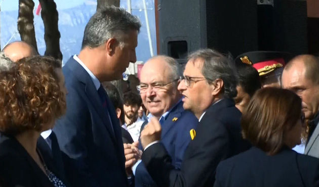 El racista presidente de la Generalidad, Quim Torra, y el líder del PP Cataluña, Xavier García Albiol, han protagonizado este sábado, 18 de agosto de 2018, una tensa discusión en Cambrils (Tarragona), momentos antes del inicio del acto de homenaje a las víctimas de los atentados islamistas de Cataluña (17-A).