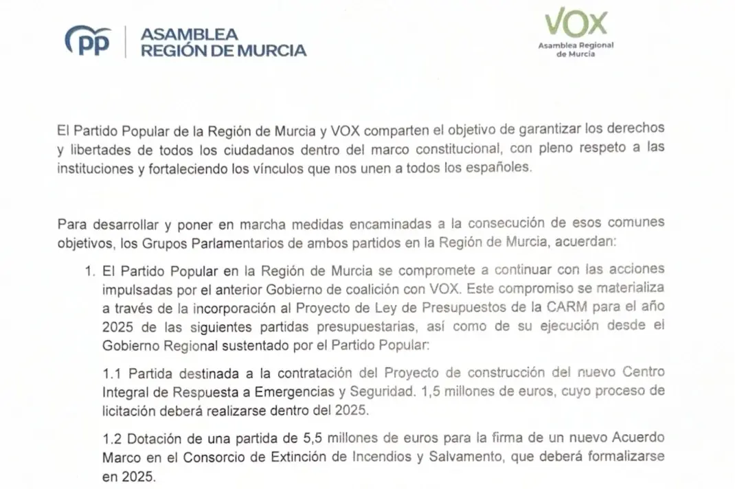 A continuación, el texto del histórico Acuerdo Presupuestos 2025 VOX y PP en Murcia: