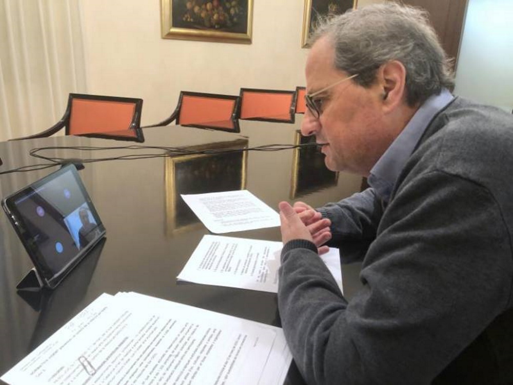 En una rueda de prensa telemática después de reunirse con los presidentes autonómicos y el jefe del Gobierno, Pedro Sánchez, Torra ha valorado las actuaciones del Ejército en Cataluña, principalmente para desinfectar el Aeropuerto del Prat y para instalar un centro de acogida en un pabellón de la Fira de Barcelona.