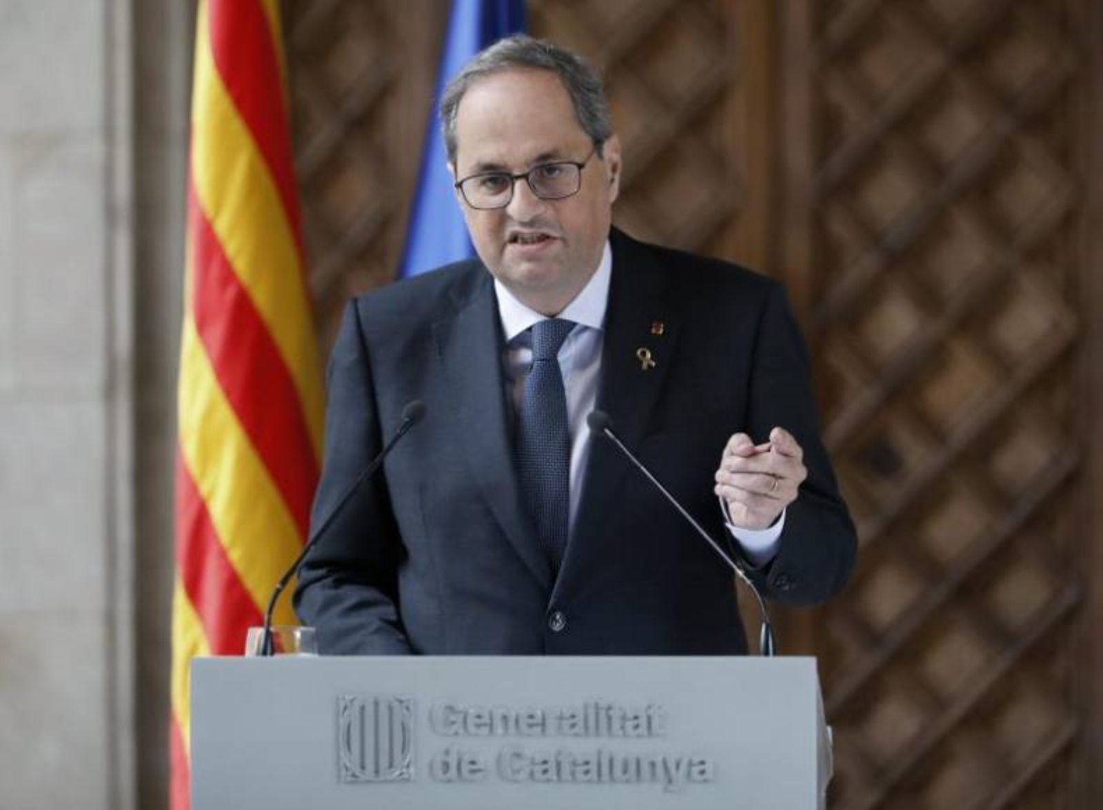 Torra ha comparecido en la Galería Gótica del Palau de la Generalitat para valorar la sentencia del Tribunal Superior de Justicia de Cataluña (TSJC), que le ha condenado a año y medio de inhabilitación por desobedecer la orden de la Junta Electoral Central de retirar los lazos amarillos de los edificios públicos antes de las elecciones generales del 28A.