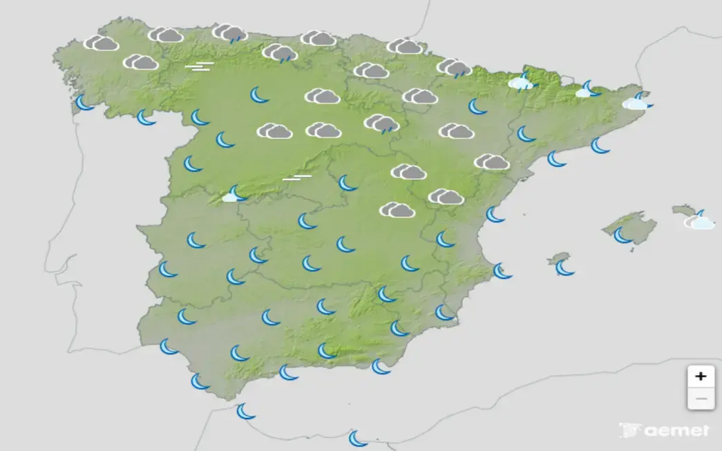 Continúa el flujo del norte sobre la Península y Baleares producido por un anticiclón situado al noroeste de la Península y la baja Ermino en formación en el Mediterráneo, dejando cielos nubosos o cubiertos en la mitad norte peninsular y precipitaciones débiles y persistentes en la vertiente cantábrica, alto Ebro, norte de la Ibérica y Pirineos, quedando los cielos poco nubosos en la mitad sur.