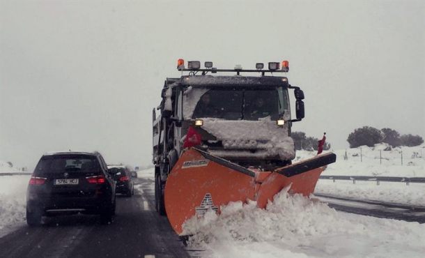 Efe – Además, se precisan cadenas o neumáticos de invierno y no pueden circular ni camiones ni autobuses por otros 19 tramos de carreteras de Castilla y León, siete en la provincia leonesa. También son necesarias las cadenas para circular por la SG-500, en el Espinar, y en la SG-615, en Valsain, en la provincia de Segovia. Valladolid (España), lunes 8 de enero de 2018. Fotografía: MADRID (ESPAÑA), 8.1.2018. Fotografía facilitada por un conductor retenido en la A-6 en sentido Madrid. Una máquina quitanieves trabaja para desbloquear la AP6. Efe.
