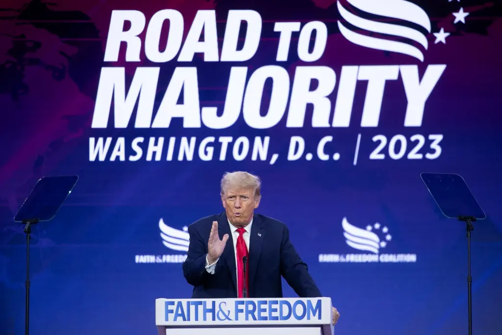 Trump participó en el cierre de la conferencia «Road to Majority» (camino hacia la mayoría) organizada por la evangelista Faith and Freedom (fe y libertad). Ofreció un discurso en el que hizo referencias constantes a Dios, ante un público totalmente entregado que le regaló aplausos y vítores.