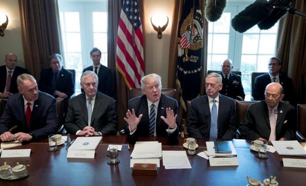 Efe – «La orden ejecutiva del presidente Trump entra dentro de su autoridad legal para mantener a la nación segura», subrayó hoy Sessions en su comunicado. El recurso ante el Tribunal Supremo supone un nuevo paso en la batalla legal contra el veto migratorio de Trump, cuya primera versión fue proclamada el 27 de enero y tuvo que ser sustituida por esta segunda versión, bloqueada por la Justicia, debido a los continuos reveses judiciales. Washington (EEUU), jueves 25 de mayo de 2017. Fotografía: El presidente estadounidense, Donald Trump (c), secretario de Estado, Ryan Zinke (i); secretario de Estado Rex Tillerson (2-i), secretario de Defensa, Jim Mattis (2-d) y el secretario de Comercio, Wilbur Ross (d), durante una reunión del Gobierno en la Casa Blanca, en Washington, Estados Unidos. Archivo Efe.