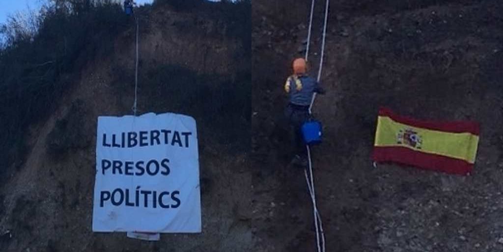 Estos tres hijos de la Nación escalaron y retiraron la pancarta gigante con la que el separatismo humillaba a los vecinos en esta localidad, considerando «presos políticos» a sus ‘Políticos Presos’; unos secuestradores de agentes de las fuerzas de Seguridad del Estado en Cataluña como son los presos sectarios llamados los «Jordis» (Jordi Sánchez de ANC y Jordi Cuixart de Ómnium Cultural); y los golpistas delincuentes comunes como los ex consejeros del gobierno cesado en Cataluña: