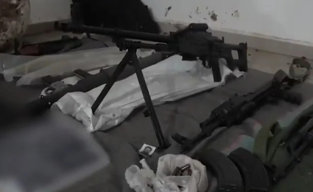 b).- Localización de armas y equipamiento militar, incluyendo dispositivos de visión nocturna, lanzadores de misiles, cohetes RPG, cargadores de munición, rifles Kalashnikov y una ametralladora.