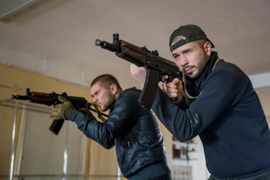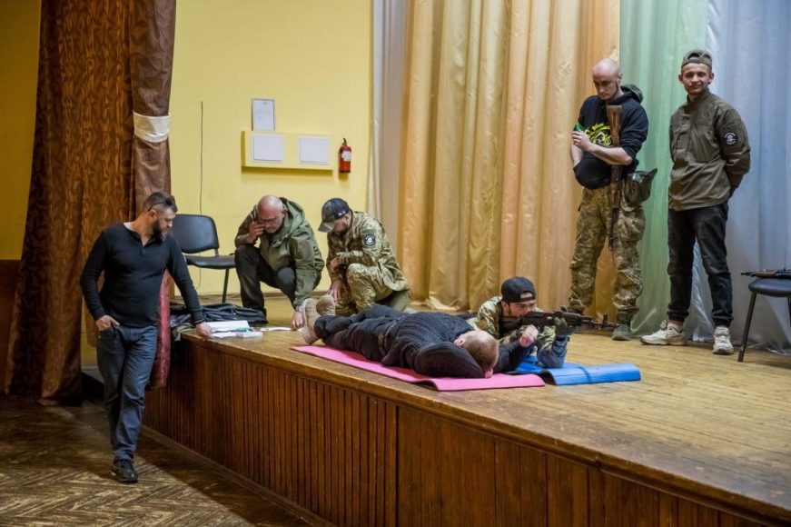 En uno de los miles de colegios de la región de Kiev que permanecen vacíos, esta cincuentena de jóvenes toman asiento en el auditorio y, como si fuera una obra de teatro, observan con atención a su instructor: un veterano de guerra que les enseña a manejar una AK-47, a cómo tomar aire antes de disparar o a qué hacer al entrar en combate dentro de un edificio.