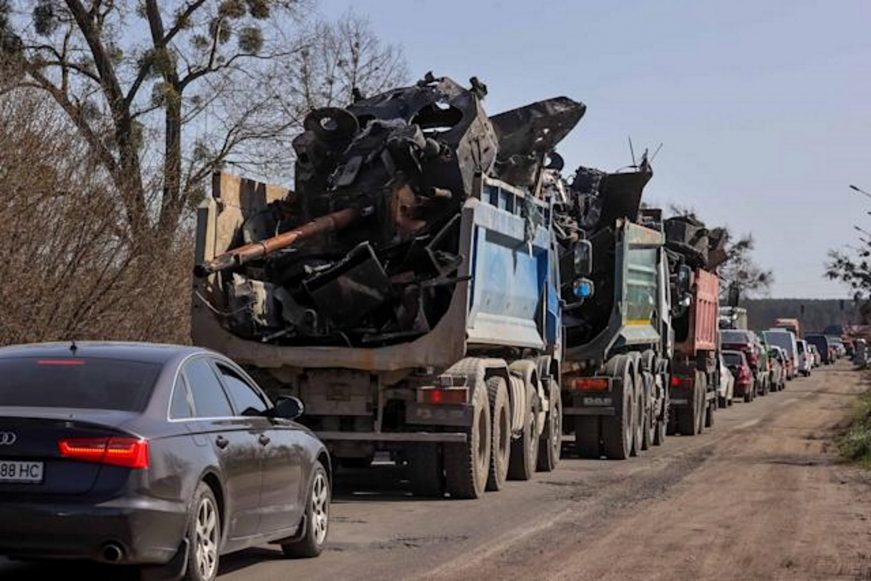 Efe.- Kiev (Ucrania), Jueves Santo (Semana Santa 2022), 14 de abril de 2022. Centenares de coches cargados con maletas y cajas formaron un gran atasco hoy en la entrada oeste de Kiev, en un momento en el que los kievitas que huyeron de la capital ucraniana por la guerra están regresando, a pesar de que las autoridades han advertido que no lo hagan.