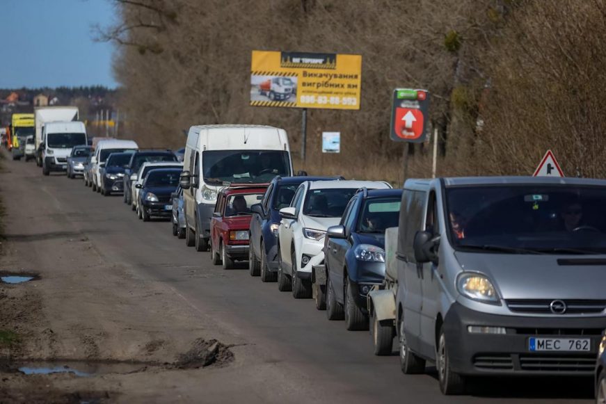 La carretera oeste de la capital, que conecta con la ciudad occidental de Leópolis, presenció largas colas de coches durante todo el día, que fueron agravadas por un aumento de los puntos de control militares.