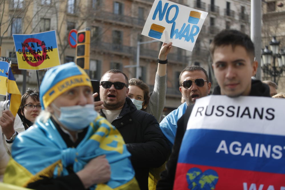 Se trata de la segunda concentración de este tipo este jueves después de que esta mañana ya una treintena de ucranianos, organizados a través de las redes sociales, se concentrara frente al consulado ruso de la avenida Pearson de la capital catalana.