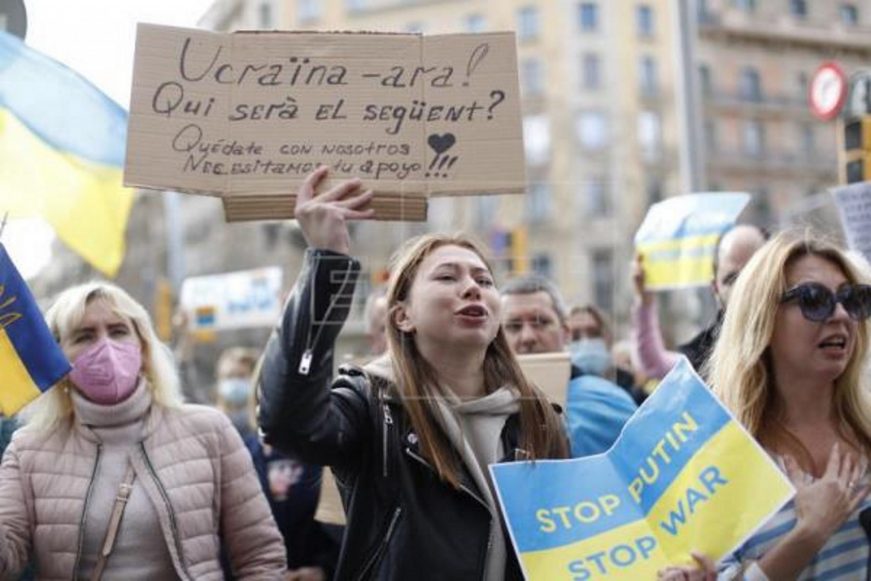 Efe.- Barcelona (España), jueves 24 de febrero de 2022. Más de 200 ucranianos se han concentrado este jueves frente a las oficinas de la Comisión Europea y la Eurocámara en Barcelona para reclamar a la Unión Europea una mayor respuesta contra el inicio de la acción militar en Ucrania ordenada desde el Kremlin por Vladímir Putin.