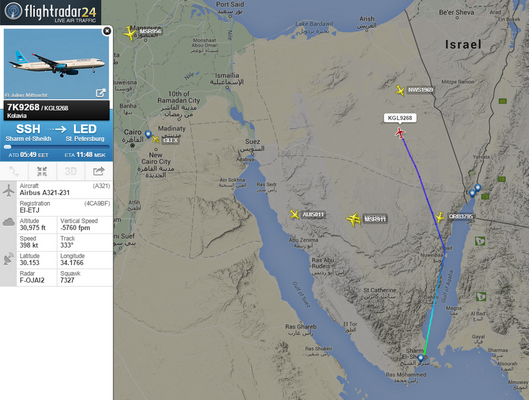 Airspace over Sinai Peninsula when #7K9268 disappeared from Flightradar24 at 04:13 UTC pic.twitter.com/H7kJk9qL6r