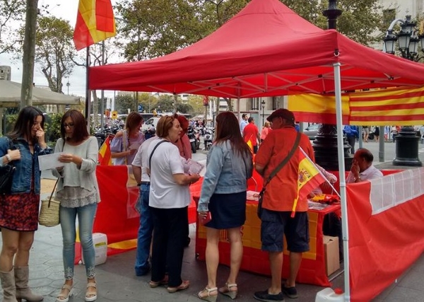 Redacción – En nuestra comunidad autónoma de Cataluña «hay personas, que desde el propio gobierno regional» de la Generalidad de Cataluña de Juntos Por El Sí (JxSí), «Ayuntamientos, colegios, televisión pública autonómica» —Corporación Catalana de Medios Audiovisuales CCMA (TV3 y Cataluña radio)–, «etc., de Cataluña, se encargan de que este mal vista la españolidad en esta parte de España. Porque tienen unos objetivos e intereses por separar y quedarse con este trozo de territorio español». Estas son las conclusiones de Juan Riera, un catalán voluntario de la plataforma catalana «Comité Organizador de la Fiesta Nacional de España» (COFNE), organización de más de 26 asociaciones que desde el inicio de este mes, 3 de septiembre 2016, instala en las calles de Barcelona carpas informativas para la gran celebración pacífica del próximo 12 de octubre 2016 en las calles de Barcelona con una concentración más tarde en Plaza de Cataluña (Barcelona), con el motivo de la Fiesta Nacional de la patria, Día de la Hispanidad (Doce de Octubre). Barcelona (España), lunes 19 de septiembre de 2016. Fotografía: Voluntarios del Comité Organizador de la Fiesta Nacional de España Día de la Hispanidad (COFNE) este sábado repartiendo la propaganda del orgullo español con el motivo del Doce Octubre 2016 en Barcelona (Cataluña), España. Lasvocesdelpueblo.