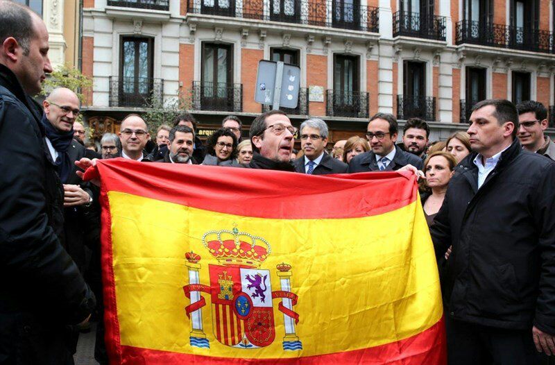 Redacción – La responsabilidad de defensa de la Unidad Nacional cae sobre cada catalán, cada español en general, y en todo el territorio Nacional. ‘Si no te mueve, no sale en la foto’ y pisotearán continuamente tus derechos fundamentales. Setra del activista español Nacho Minguez. Madrid (España), jueves 2 de marzo de 2017.. Fotografía: El español Nacho Minguez, con su bandera de España entre los separatistas catalanes en Madrid. De izquierda a la derecha: Guardia de seguridad seguido del consejero de exteriores del gobierno catalán, Raúl Romeva; el presidente del grupo de Juntos Por El Sí en el Parlamento de Cataluña, Jordi Turull; el presidente de Asamblea Nacional Catalana (ANC), Jordi Sánchez; la secretaria de ERC y número dos de JxSí en el Parlamento de Cataluña, Marta rovira; y seguido de Francesc Homs Molist, el encausado por el 9N 2014 en Cataluña y actual portavoz de PDECAT en el Congreso quien era el consejero de presidencia del gobierno de Artur Mas durante el golpe del 9N. Imagen facilitada por el español Nacho Minguez en Twitter. lasvocesdelpueblo.
