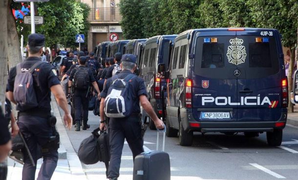 Los policías alojados en el Hotel Gaudí de Reus (Tarragona) abandonando el establecimiento, un día después de que las cuatro formaciones independentistas del consistorio de esta localidad firmaran un comunicado pidiendo su desalojo. EFE/Archivo